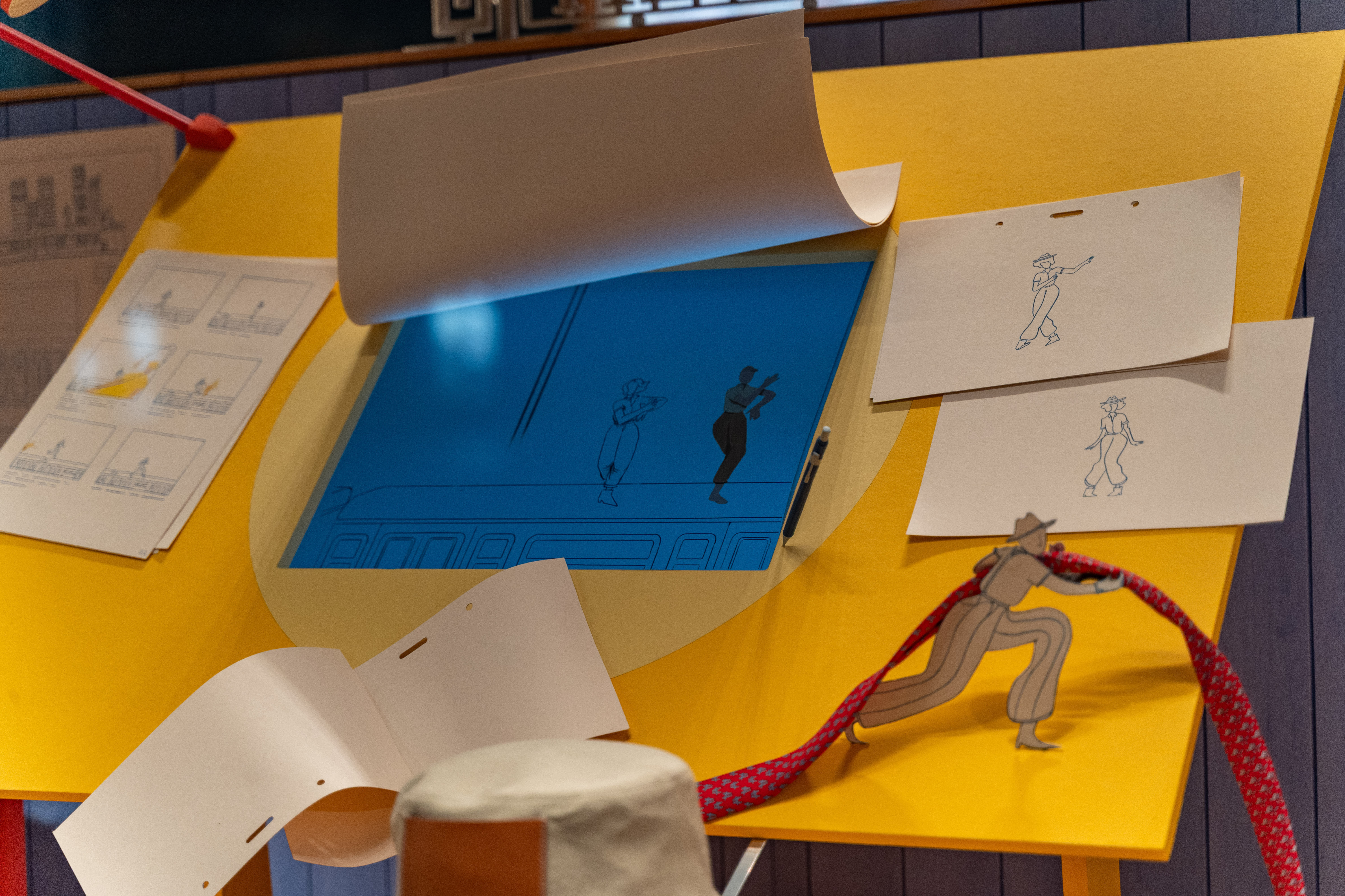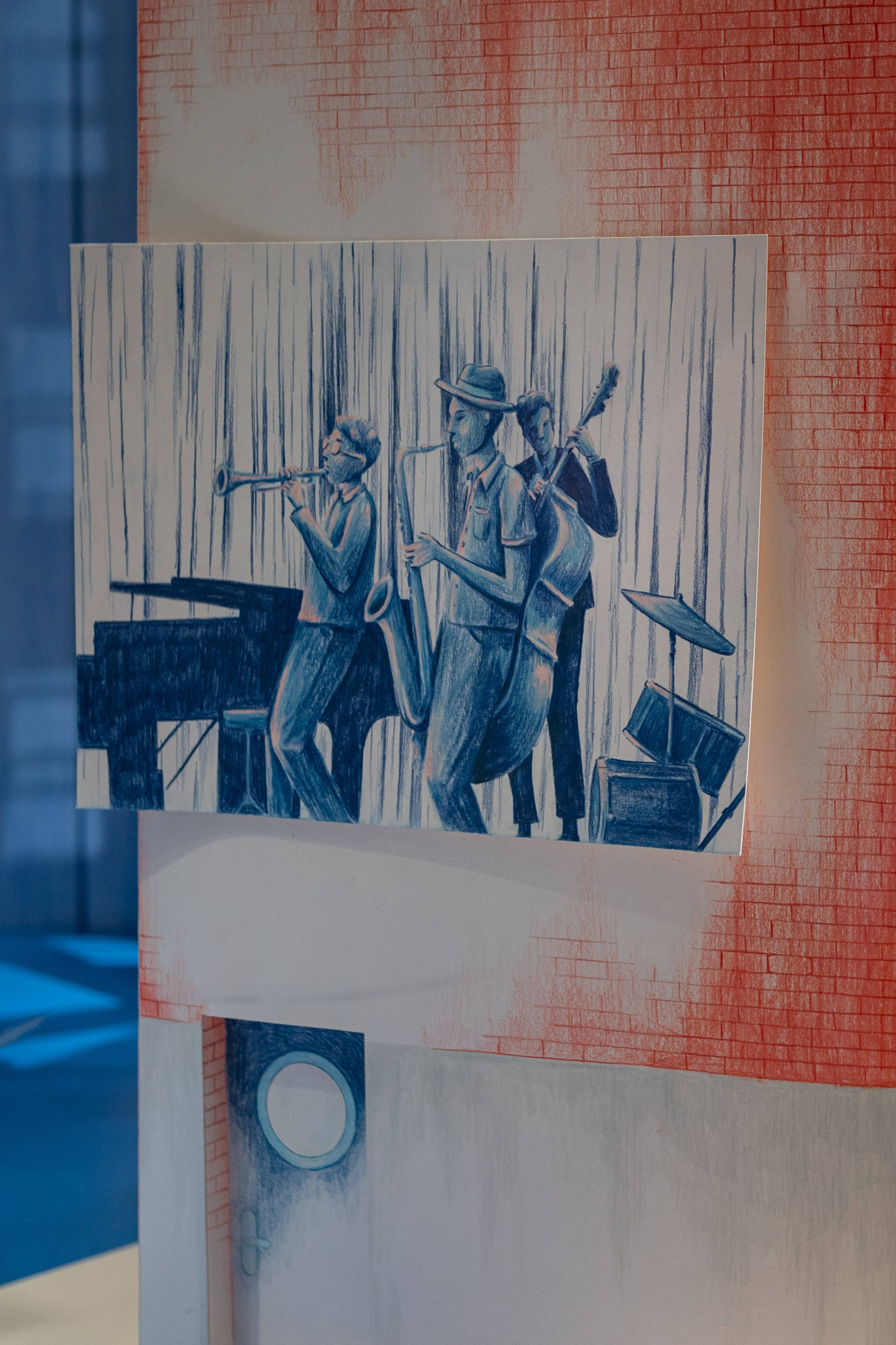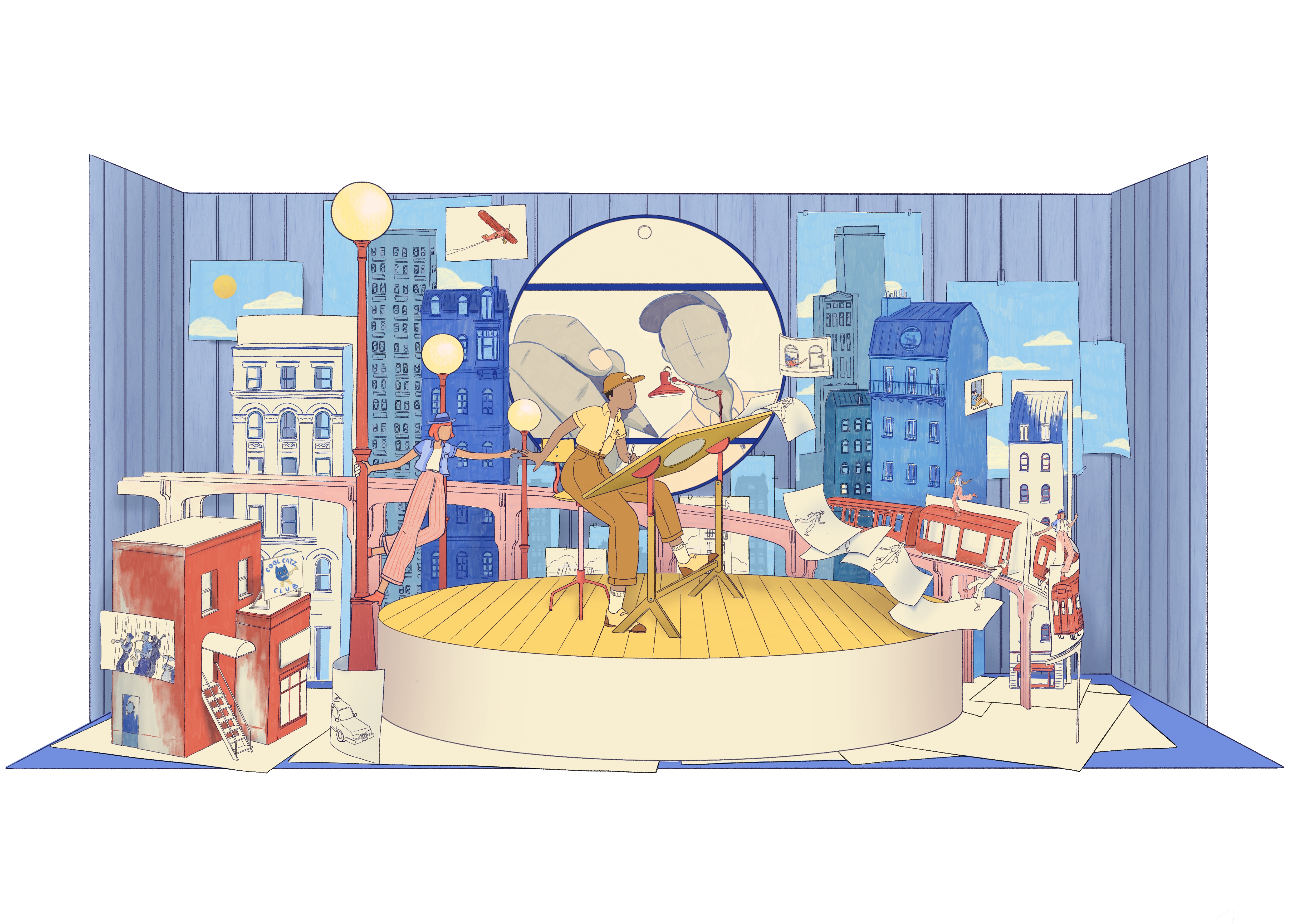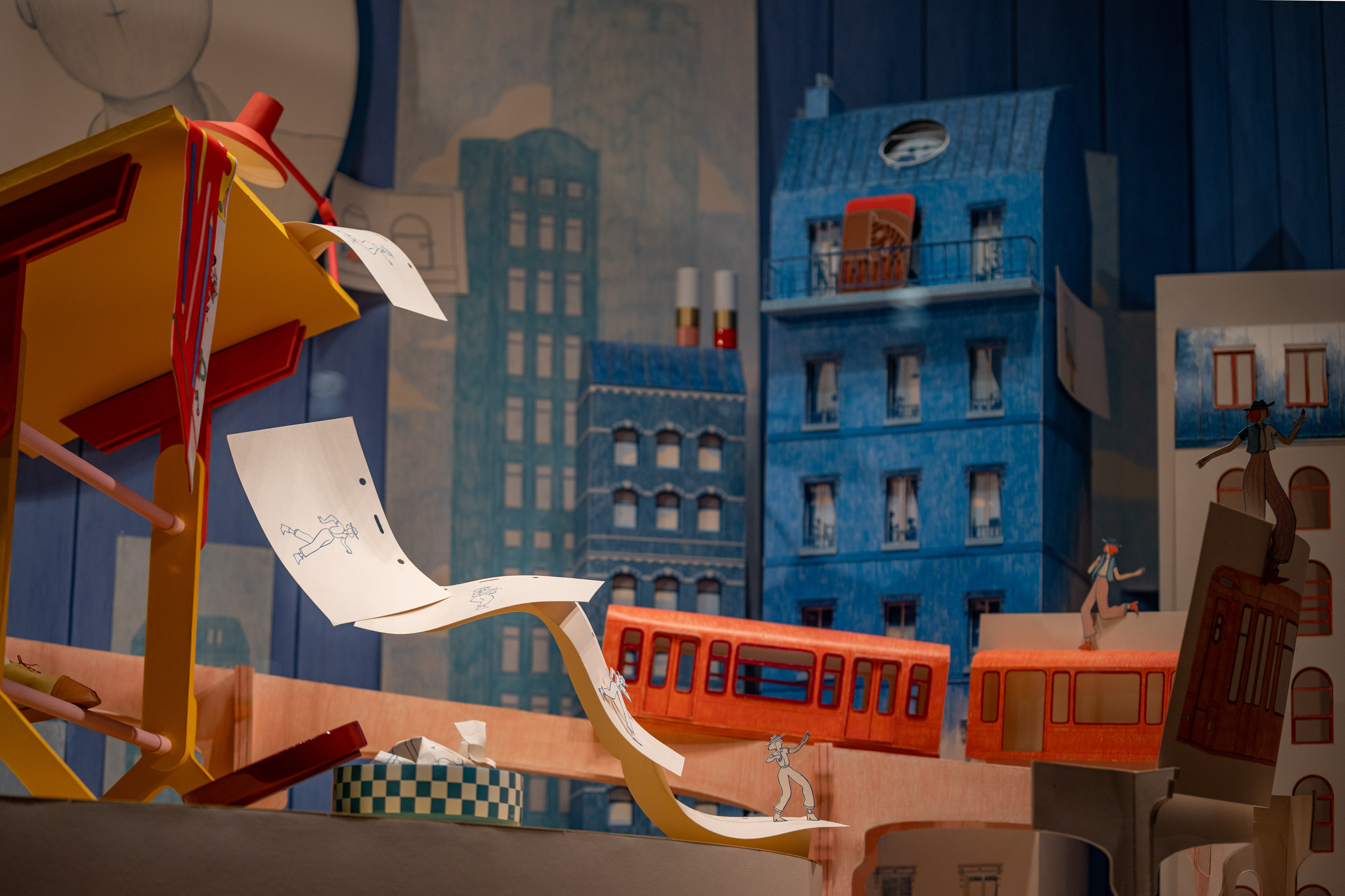 We made all the elements in paper and gave a special focus on hand-drawn details. Each windows and doors of each building were drawn on the paper with colour pencils.